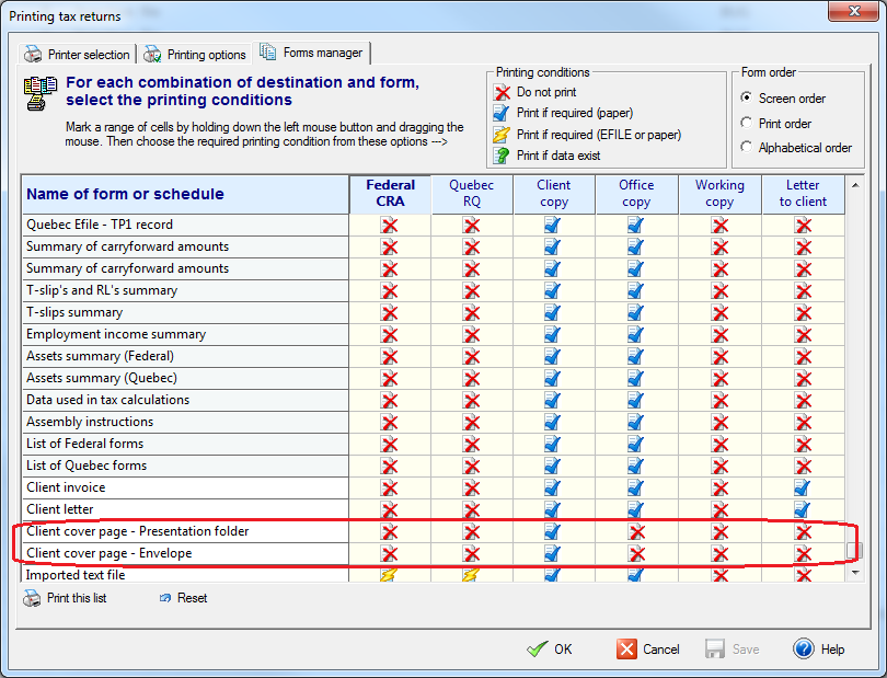 DT Impressions, the exclusive partner of DT Professional Suite, is a supplier of quality presentation folders and window envelopes for professional tax preparers. These products have been approved by the technical developers of DT Professional Suite to work with the cover pages generated by DT Max (available in T1 and T3 now, and later in T2 in a subsequent release). For more information, or to order any of their products, please visit the DT Impressions website (http://dtimpressions.ca/). Printing optionsTo have these cover pages print with the tax return, you need to enable them by selecting the Printing options item found under the Preferences menu. In the DT Impressions section, select the style of presentation folder/envelope that you have purchased. Forms managerBy default, the cover pages are set to print as part of the client copy during production printing. This can easily be changed if desired. See the Forms manager knowledge base page for information on how to do this.