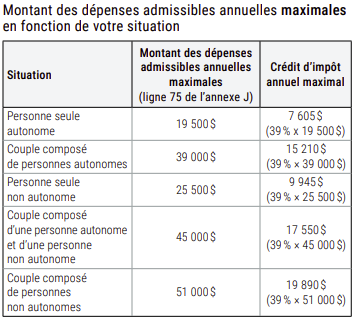 Ce crédit d'impôt est égal à 39 % de vos dépenses admissibles. Voyez le tableau ci-après pour connaître le montant des dépenses admissibles annuelles maximales que vous pouvez inscrire à la ligne 75 de l'annexe J, selon que vous êtes une personne autonome ou une personne non autonome.