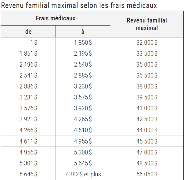 Si vous avez inscrit un montant à la ligne 381, cherchez dans le tableau qui figure ci-après le revenu familial maximal qui correspond au montant de vos frais médicaux (ligne 36 de l'annexe B) plus, s'il y a lieu, la déduction pour produits et services de soutien à une personne handicapée (ligne 250, point 7). Comparez ensuite ce revenu familial maximal avec votre revenu familial, soit le montant de la ligne 275 de votre déclaration plus, s'il y a lieu, celui que votre conjoint(e) au 31 décembre 2024 a inscrit à la ligne 275 de sa déclaration.