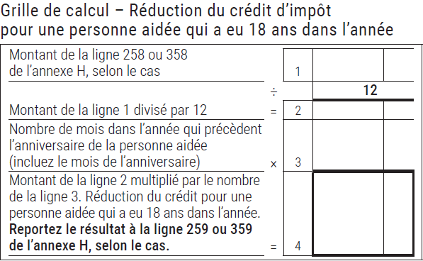 Si une personne aidée admissible a eu 18 ans en 2024, remplissez la grille de calcul ci-dessous pour déterminer le montant de la réduction du crédit pour cette personne.