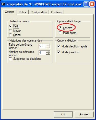 Lorsque vous obtenez la fenêtre noire, appuyez sur ALT + TAB pour basculer vers une autre application. Puis dans la barre des tâches, faites un clic droit sur le bouton « C:\WINDOWS... » et choisissez « Propriétés ». Changez l'option d'affichage à « Fenêtre » et cliquez sur « OK ». Dans la nouvelle fenêtre « Appliquer les propriétés », choisissez « Enregistrer les propriétés pour les fenêtres futures ayant le même titre ». Cliquez sur « OK ».