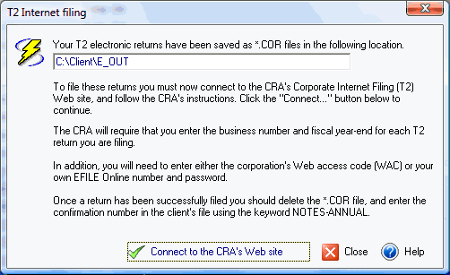Clicking Close will bring you to the T2 Internet filing menu. This menu allows you to connect to the CRA's Web site where you will have to complete the identification area and attach the file (making sure to include the ".COR" extension).