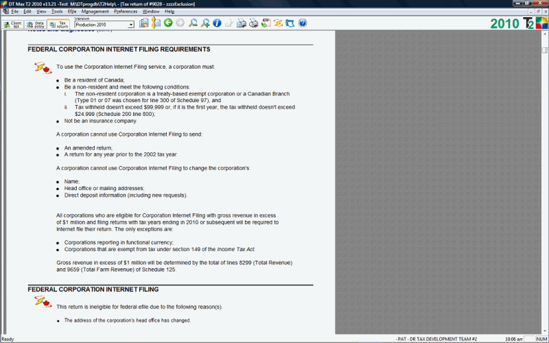 Step 2 - Reviewing the eligibility requirements and legal obligationsPrior to transmitting a corporate return, you must determine whether or not it is eligible for efile. Should a return be ineligible, DT Max will mention it in the Notes and diagnostics page. You may also visit the CRA's Web site for an up-to-date list of the exceptions and restrictions as well as go over your legal obligations.