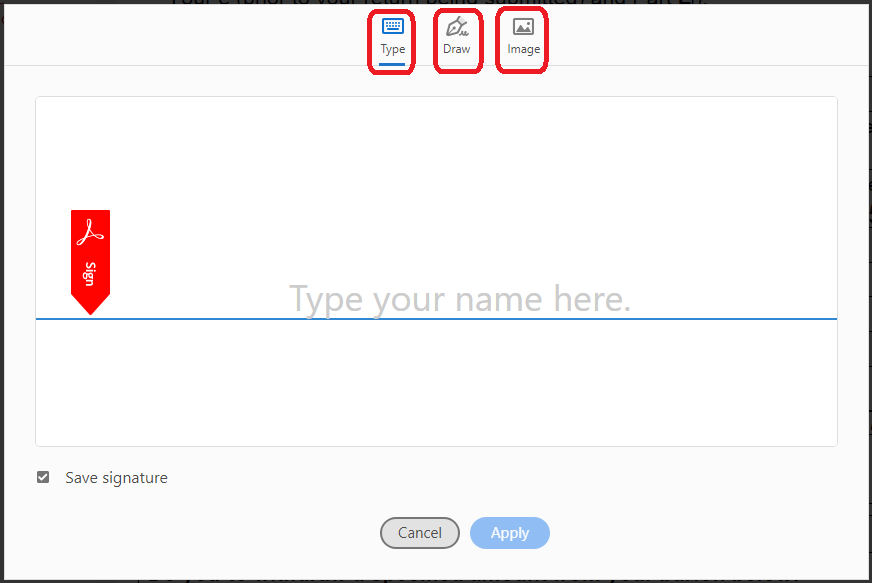 Either type the signature, draw it, or use an already saved image of the signature.