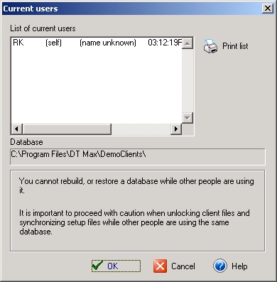 It is obviously important to know who is using the DT Max database before attempting to use any of these tools. To find out, choose List other users from the Tools menu and you will see the following dialogue box: