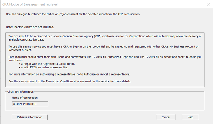 The procedure below is in accordance with CRA's prescribed rules and regulations relating to their T2 Auto-fill secure service, available with T2 certified software products, that lets business owners and authorized representatives download information from the CRA to their tax preparation software.