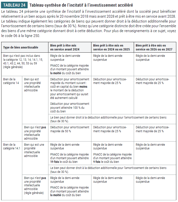 Si la société acquiert de tels biens qui sont considérés comme des BIIA et qui sont prêts à être mis en service en 2024, l'incitatif à l'investissement accéléré lui permet de majorer la PNACC de la catégorie d'un montant égal à la moitié du coût des acquisitions nettes plutôt que d'un montant égal à ce coût. Pour faire partie de la catégorie 43.2, les biens doivent être acquis avant 2025.