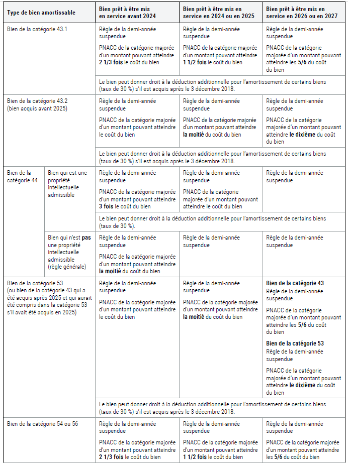 Si la société acquiert des biens de la catégorie 54 ou 56 qui sont prêts à être mis en service dans l'année d'imposition et avant 2024, elle peut majorer la PNACC de cette catégorie pour cette année d'un montant égal à deux fois et un tiers le coût des acquisitions nettes et ainsi bénéficier d'une déduction pour amortissement pouvant atteindre 100 % du coût des acquisitions nettes relativement à ces biens acquis.