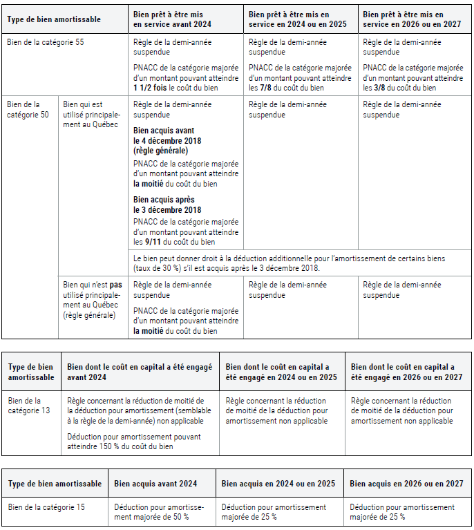 Si le bien est prêt à être mis en service avant 2024, la PNACC aux fins du calcul de la déduction pour amortissement est égale à 166 667 $ [50 000 $ + (50 000 $ × 2 1/3)]. Ainsi, la déduction pour amortissement maximale pour l'année d'imposition est de 50 000 $ (166 667 $ × 30 %), ce qui correspond au coût d'acquisition.