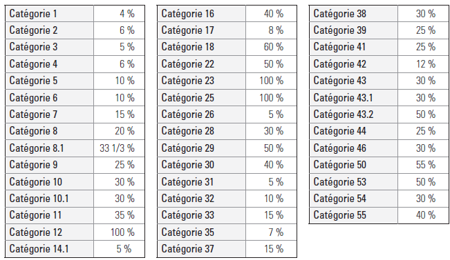 Les biens des catégories 13, 14, 15 et 29 sont amortis selon la méthode linéaire. Le taux d'amortissement des biens de la catégorie 36 est de 0 %.