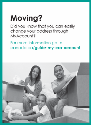 If you have registered with our My Account service or our mobile apps, you can change your address by going to canada.ca/my-cra-account or canada.ca/cra-mobile-apps and selecting MyCRA or MyBenefits CRA. If not, you must tell us your new address by phone or in writing, or by completing and sending Form RC325, Address change request.
