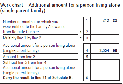 The additional amount for a person living alone (single-parent family) must be reduced if, at any time in 2024, you were entitled to the Family Allowance from Retraite Québec. To calculate the additional amount to which you are entitled, use the work chart opposite.