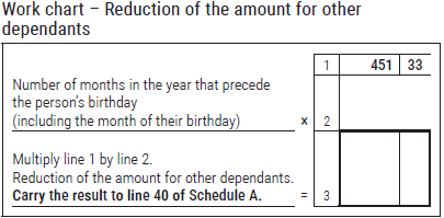 If someone else also contributed to the support of your dependant, you may have to split the amount that can be claimed on line 54 of Schedule A with that person. If that is the case, multiply the amount on line 54 by the percentage that you and the other person agree on. The total percentage must not be more than 100%.
