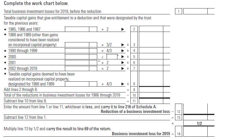 Business investment losses must be reduced by the amounts the trust allocated to the beneficiaries in a previous year and that the trust designated as taxable capital gains that give entitlement to a deduction. The amount of the reduction (line 12 of the work chart) is considered a capital loss and must be carried to line 216 of Schedule A.