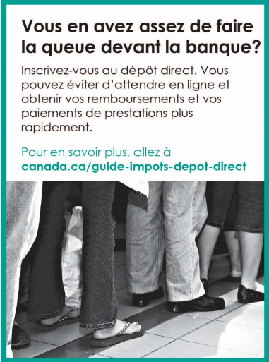 Le dépôt direct est une façon rapide, pratique, fiable et sécuritaire de recevoir vos versements de l'ARC directement dans votre compte à une institution financière canadienne. Pour vous inscrire au dépôt direct ou pour mettre à jour vos renseignements bancaires, lisez la page 73 ou allez à canada.ca/arc-depot-direct.