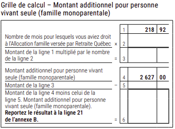 Montant additionnel pour personne vivant seule (famille monoparentale) [ligne 21 de l'annexe B]