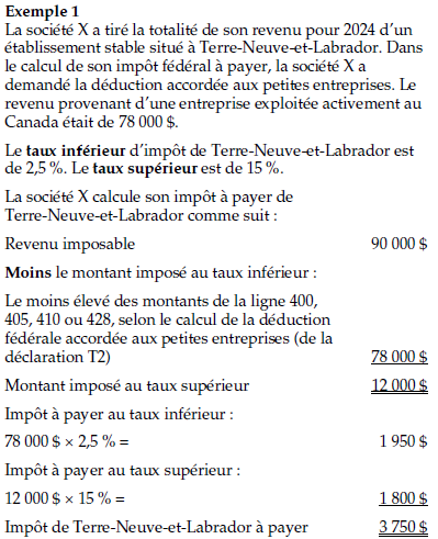 Le taux supérieur s'applique aux autres revenus. Vous trouverez des détails sur le revenu admissible pour chaque taux et les taux qui s'appliquent à chacune des provinces et à chacun des territoires aux sections suivantes de ce chapitre ainsi qu'à canada.ca/fr/agence-revenu/services/impot/entreprises/sujets/societes/taux-impot-societes.