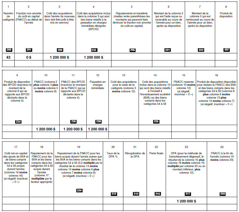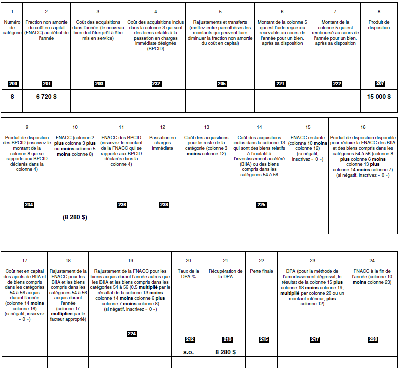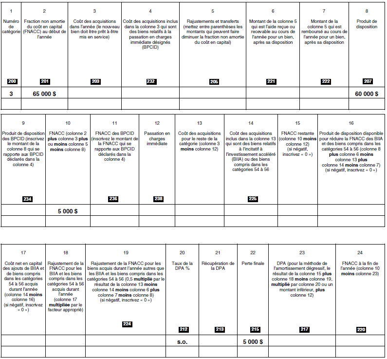 Inscrivez dans cette colonne le résultat que vous obtenez en soustrayant le montant de la colonne 23 du montant de la colonne 10. Lorsqu'il y a eu récupération de la DPA ou perte finale pour une catégorie donnée, la fraction non amortie du coût en capital à la fin de l'année est toujours « 0 ».