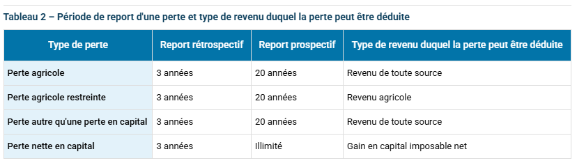 Le tableau ci-après présente la période de report applicable à chaque type de perte ainsi que le type de revenu duquel chaque perte peut être déduite.