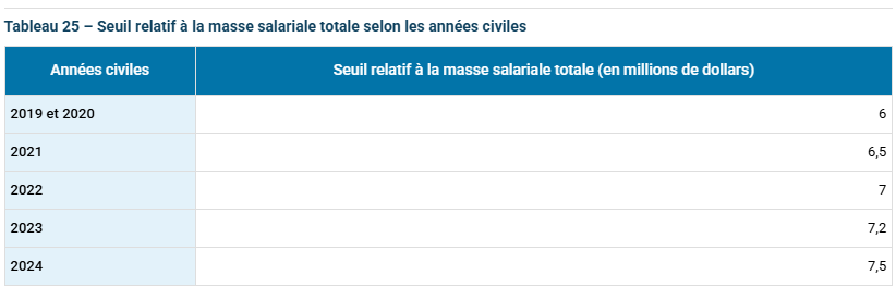 Le tableau 25 présente le seuil relatif à la masse salariale totale selon les années civiles.