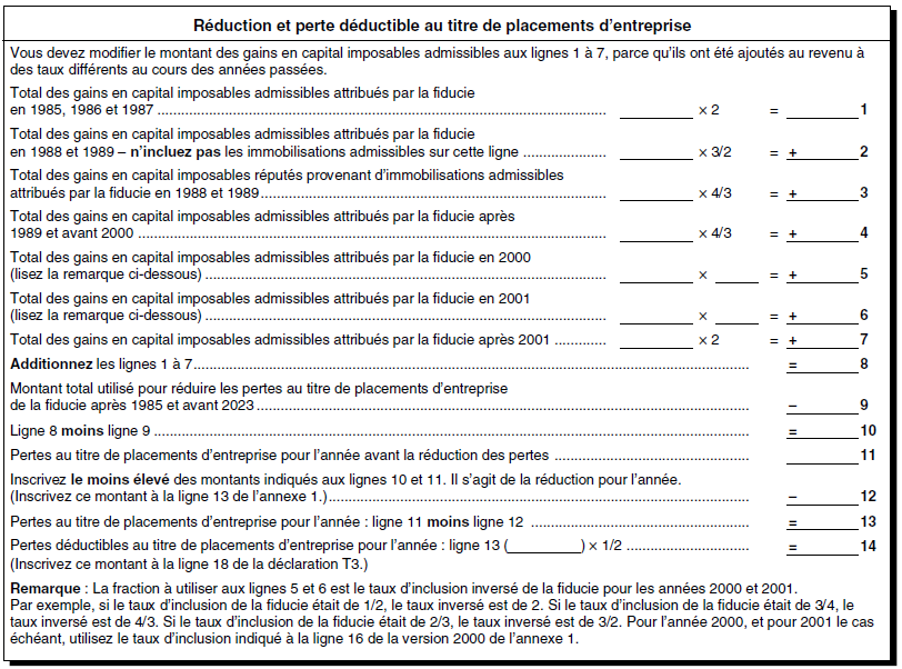 Utilisez le tableau suivant pour calculer la réduction de la perte au titre de placements d'entreprise. Si la fiducie a subi plus d'une perte au titre de placements d'entreprise dans l'année, utilisez le tableau pour calculer la réduction totale.
