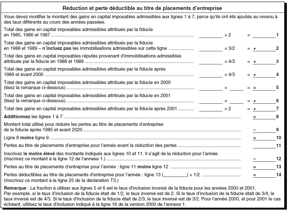 Utilisez le tableau ci-dessous pour calculer la réduction de la perte au titre de placements d'entreprise. Si la fiducie a subi plus d'une perte au titre de placements d'entreprise dans l'année, utilisez le tableau pour calculer la réduction totale.