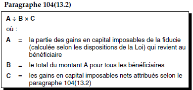 Utilisez les formules suivantes pour calculer les attributions selon les paragraphes 104(13.1) et 104(13.2). Faites-le pour chaque bénéficiaire. Une fiducie ne peut pas utiliser ces attributions pour imposer la part d'un bénéficiaire dans la fiducie et répartir une autre part au profit d'un bénéficiaire, sauf si l'acte de fiducie prévoit qu'un bénéficiaire a droit au revenu de la fiducie et qu'un autre bénéficiaire a droit à son capital.