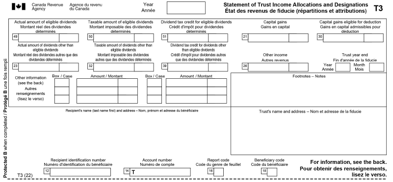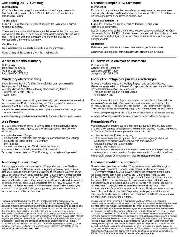 Remplissez une copie du feuillet T3 pour chaque bénéficiaire et faites-les parvenir avec votre Sommaire T3. Inscrivez les renseignements pour deux bénéficiaires distincts par feuille. Ceci nous permettra de traiter votre déclaration de renseignements plus rapidement. Vous devez conserver une copie des feuillets T3 et du Sommaire T3 pour vos dossiers.