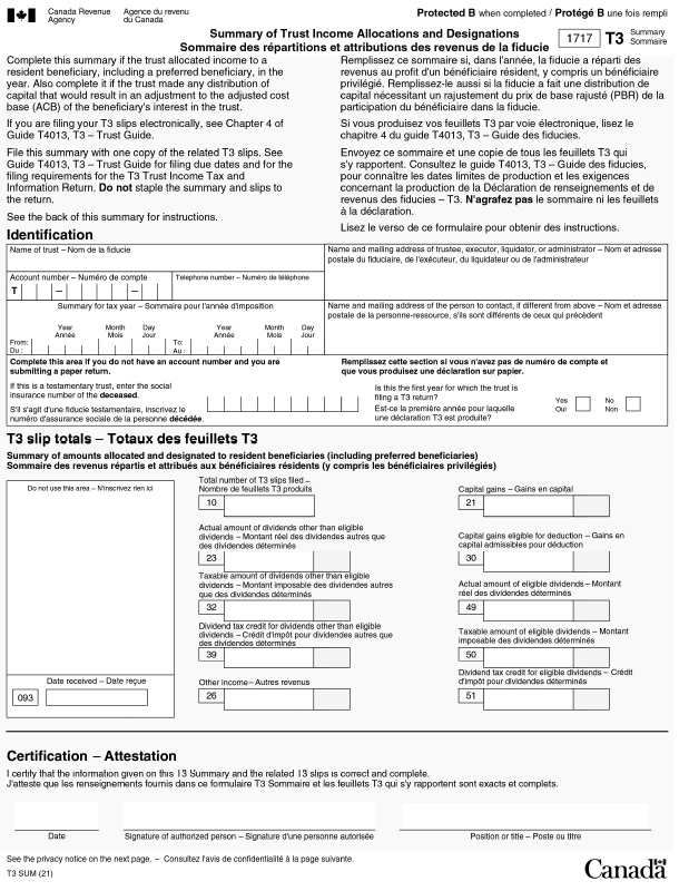 Envoyez-nous les feuillets T3 avec le formulaire T3 Sommaire dans les 90 jours suivant la fin de l'année d'imposition de la fiducie. Voir « Fin de l'année d'imposition et de l'exercice » à la page 20.
