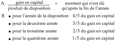 Il arrive qu'une partie du produit de disposition (généralement pour un bien immeuble) ne vous soit due qu'après la fin de l'année. Vous pouvez alors reporter une partie du gain en capital à l'année où vous êtes en droit de recevoir le produit de disposition. Il vous suffit d'établir une réserve pour gains en capital. Ainsi, vous pouvez répartir le gain en capital sur une période maximale de cinq ans.