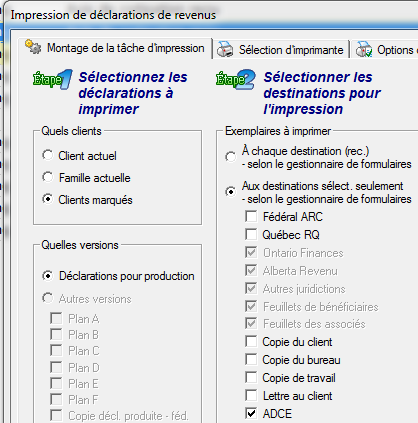 Vous pouvez aussi imprimer des lots d'avis de cotisation en utilisant une destination personnalisée qui se trouve dans les Options d'impression.