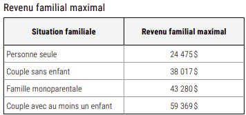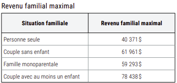 Si votre revenu de travail dépasse le montant mentionné précédemment, cherchez dans le tableau ci-après le revenu familial maximal qui s'applique à vous en fonction de votre situation familiale. Si votre revenu familial égale ou dépasse le revenu familial maximal, vous n'avez pas droit à la prime au travail. S'il est inférieur, remplissez la colonne 1 de la partie E de l'annexe P.