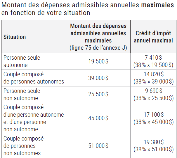 Ce crédit d'impôt est égal à 38 % de vos dépenses admissibles. Voyez le tableau ci-après pour connaître le montant des dépenses admissibles annuelles maximales que vous pouvez inscrire à la ligne 75 de l'annexe J, selon que vous êtes une personne autonome ou une personne non autonome.