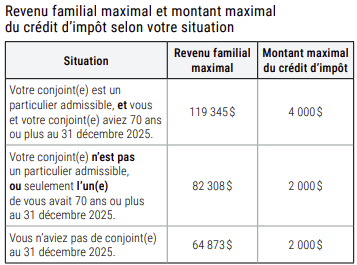 NOTE Si votre conjoint (e) est décédé (e) en 2025, il ou elle devait remplir les conditions d'admissibilité le ou la concernant au moment de son décès plutôt qu'au 31 décembre 2025. |