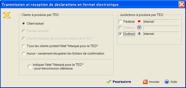 Étape 3 - Obtenir le consentement du clientLorsque vous transmettez une déclaration de revenus des sociétés par le biais de Mon dossier pour les entreprises, vous devez vous assurer que la société visée vous a accordé une procuration. Vous pouvez consulter une liste des entreprises qui vous ont accordé une telle procuration en accédant au site Web. Si une société ne vous a pas accordé de procuration, elle peut le faire électroniquement après s'être inscrite à Mon dossier pour les entreprises, ou vous pouvez compléter le formulaire MRW-69.E Autorisation relative à la communication de renseignements à une personne inscrite à Mon dossier pour les entreprises ou procuration. Lorsque vous transmettez une déclaration de revenus des sociétés par le biais d'ImpôtNet, DT Max remplira le formulaire CO-1000.TE Transmission par Internet de la déclaration de revenus d'une société. Vous devrez obtenir la signature de votre client avant de procéder à la transmission de la déclaration de revenus des sociétés. Étape 4 - Procéder à la transmissionPour transmettre une déclaration des sociétés, cliquez sur l'icône TED ou sélectionnez Transmission et réception au menu TED. Bien que vous ayez l'option de transmettre le client actuel ou un lot spécifique de clients, nous vous recommandons de transmettre une déclaration à la fois. DT Max transmettra le sommaire de saisie CO-17 et les données de l'IGRF par TED mais soumettra cependant toutes les autres annexes en format PDF. Toutes pièces justificatives additionnelles devant être annexées pourront être jointes par l'intermédiaire du mot-clé Annexe-Ted-Qc. Lorsque vous aurez cliqué sur Poursuivre, DT Max générera et transmettra la déclaration électronique et récupérera tout fichier de confirmation disponible. Bien que la transmission ait lieu en temps réel, vous noterez probablement un délai alors que DT Max génère et transmet le fichier en question.